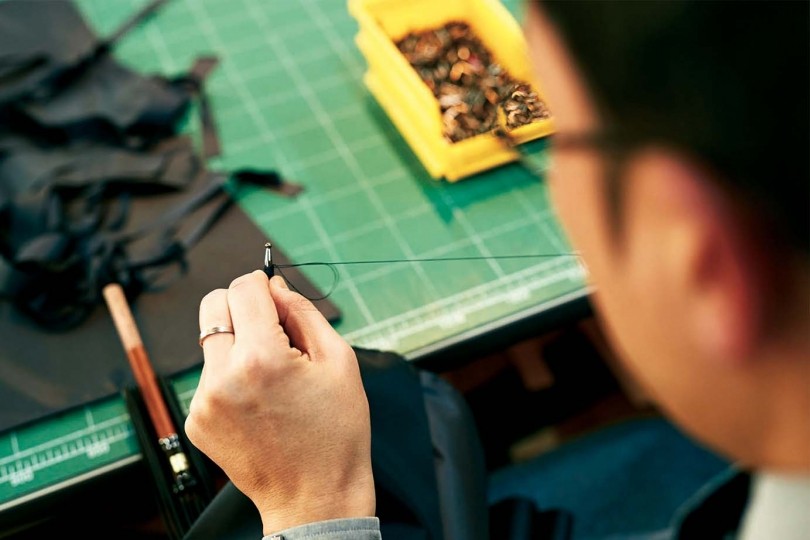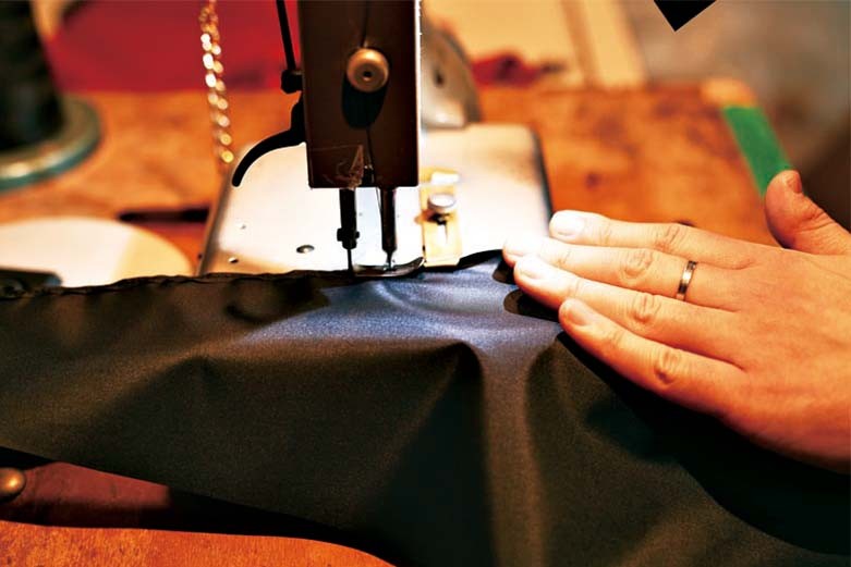2.三角形に裁断した「小間」と呼ばれる生地を、2枚ずつ端を折り込みながら1本糸の環縫いミシンを使って縫っていく。その際、撥水加工が施された糸を使う。