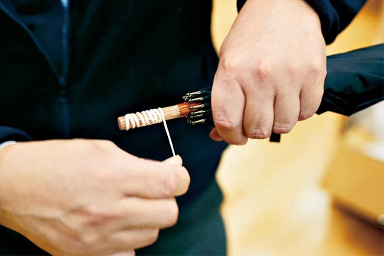 3.縫い合わせたら、中棒の上の部分に縫い留める「てんかがり」という作業に移行。傘の張力を支える重要な部分で、傘の開きに影響するためしっかりと縫い付ける。中棒には強度がある樫(かし)の木を使用。