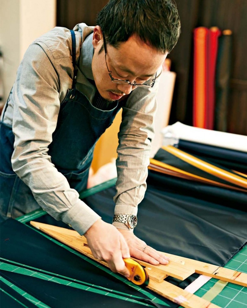 1.加工職人自らが調整し、つくった三角形の「木型」を裁断する生地にあて、ローラーカッターで裁っていく。