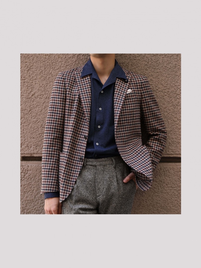 トリコールで彩ったシェパードチェックのジャケットは、軽い仕立てが特徴の"イージー"モデルを採用。オープンカラーシャツを合わせて新鮮な着こなしに。