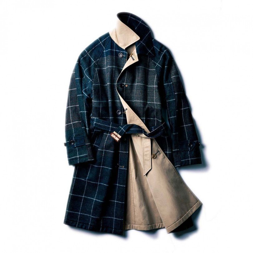 リバーシブルのトレンチコートは、先染めの超高密度ギャバジンで仕上げたコットン面と、試し織りで糸の交わりを確認するための“マス見本”をデザイン化したウール面が楽しめる。ステンカラーコート99,900円