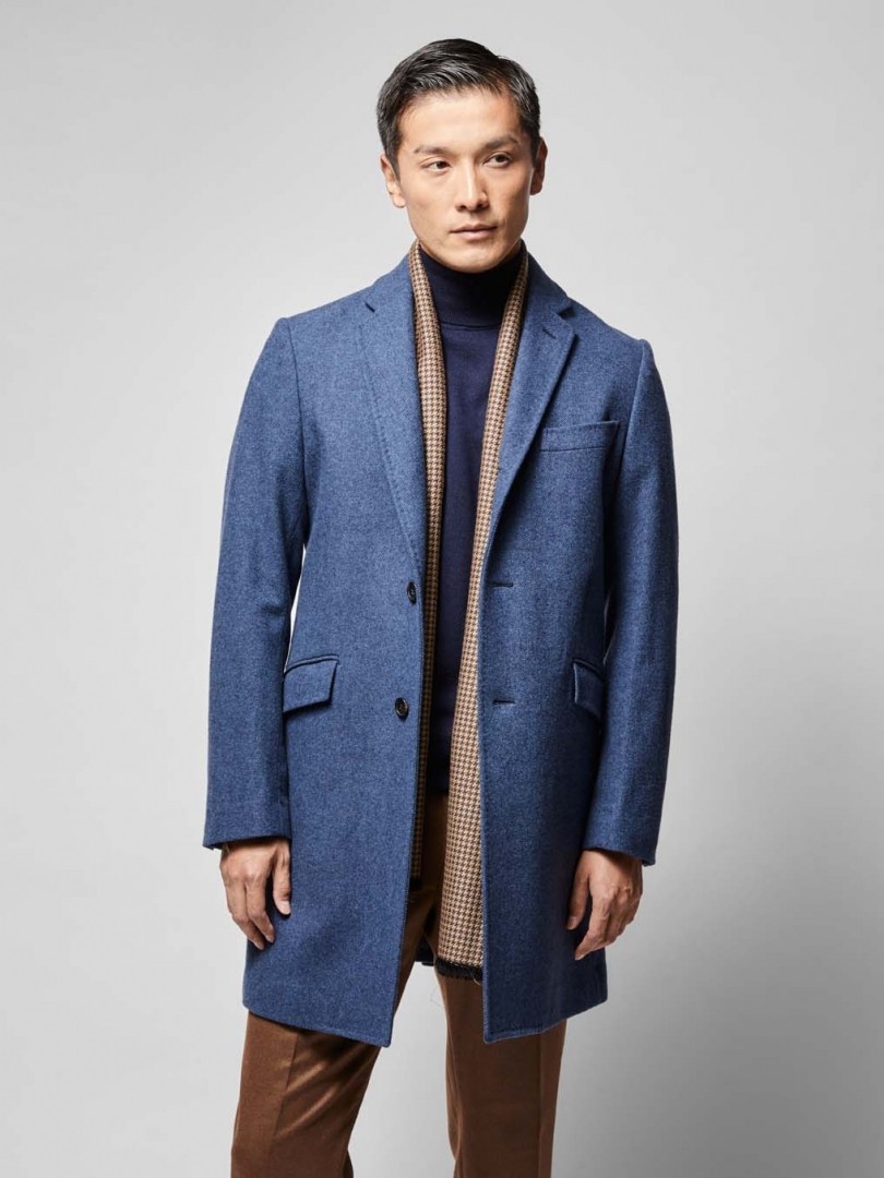 コートはコーディネートの全体を占めるので、明るめのきれいな色を選ぶと洗練された印象が高まりますね。ブルーは「やりすぎ感」がなく、特におすすめです。写真のようにストールをコートの内側にサラッとかけるだけで、よりおしゃれに見えますよ。