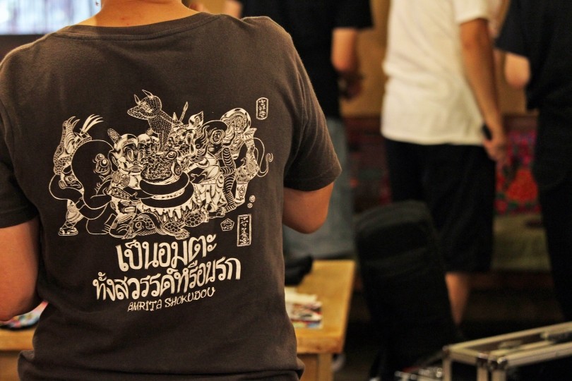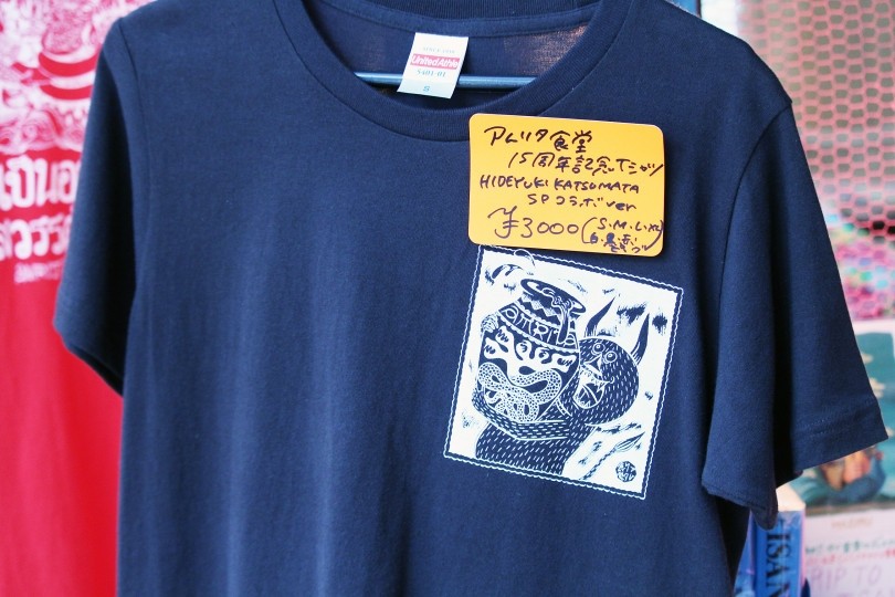 取材当日にライブペインティングを行うなど、親交の深い吉祥寺・アムリタ食堂の15周年記念Tシャツのデザインも手がけた。