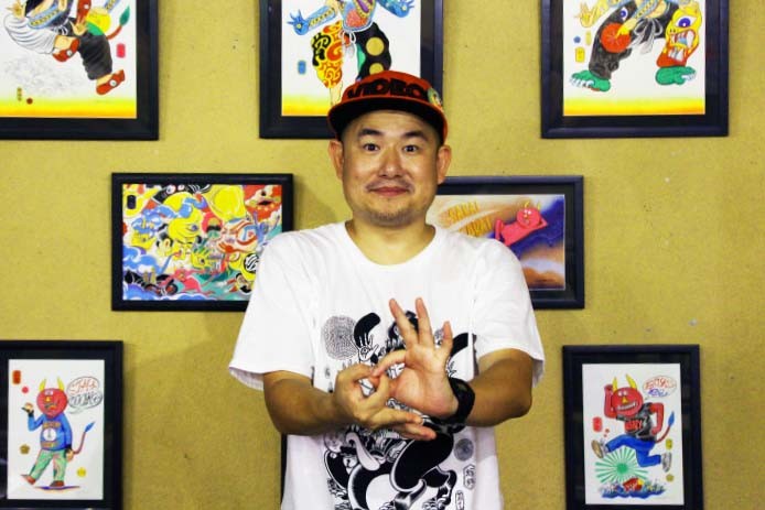 Hirottonに続いて第2弾として登場するのは、妖怪や宗教的なモチーフを、独特の和テイストのタッチで描き出すHideyuki Katsumata。人気キャラクター「hanautah(ハナウタ)」をはじめ、海外でも人気を博すペイント・アーティストである。今回は彼が15周年記念Tシャツのデザインも手がけ、この日ライブペインティングを行うなど親交の深い吉祥寺はアムリタ食堂にて話を訊いた。