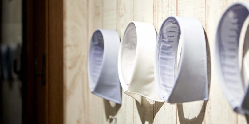 代表の南祐太はノータイでボタンをあけたとき、ボタンとボタンのあいだの生地がもたつくのがいやで引っ張っていた。前下がりの型紙はこのときのシルエットがヒントになった。結果、もたつきも解消されたという。南はこれまでのサンプリングから3つの傾斜角を導いた。首裏にも2つのシルエットがあるので、台襟の型紙は都合6つのバリエーションが揃う。