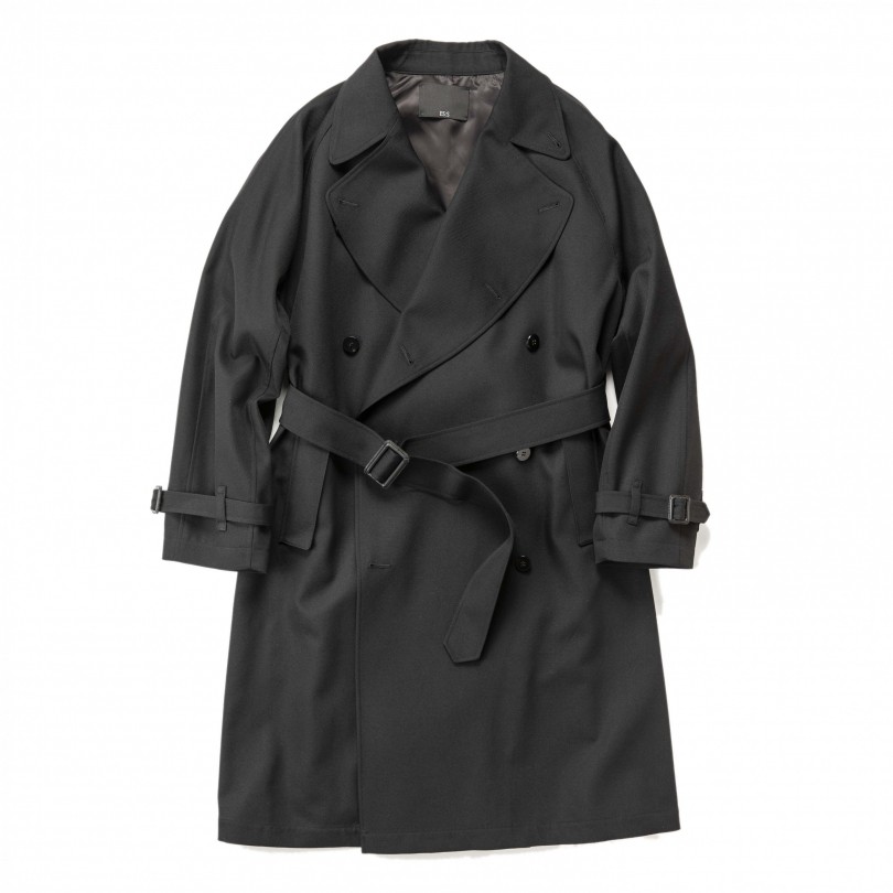 トレンチコートならではの男っぽさは残しつつ、エポーレット(肩章)やショルダーパッチなどをあえて取り除くことでモードな雰囲気を醸しだす日本ブランド<エス>のトレンチコート。最大の特徴は大きく丸い全体のフォルムと大きな襟の曲線で、着ると身体に馴染んでいくシルエットはやみつきに。ベルトをマークすればグッとダンディな装いになり、前を開けて着ればラフ&カジュアルにと、エレガントな匂いを楽しみながらヴィンテージ風オーバーコートの着こなしが楽しめる。