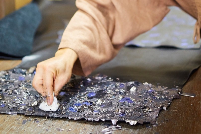 金や銀の箔を糸に織り込む西陣帯箔の「引箔」という技法を用いた模様箔は、レザーに箔や塗料を幾重にも重ねることで光の重なりが生み出され、美しく繊細な輝きを放ちます。また、古来からある唐草模様を「手捺染」と呼ばれる手法を用いて、京友禅の職人の手により美しく染め上げたレザーなど、長きに亘り培われてきた日本ならではの美的センス、そして伝統の持つ洗練された美しさをレザーに表現しています。