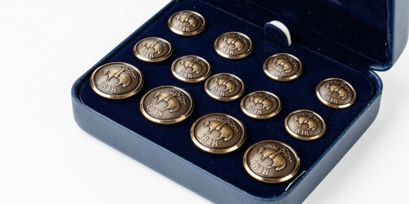 さらにネイビーブレザーといえば、メタルボタン。ボタン専業メーカーとして、<ブルックス ブラザーズ>よりも長い歴史を誇る名門・ウォーターバリー社謹製の替えボタンセットも発売される。200年以上の長い歴史のなかで、9回ものロゴ変更を行っている<ブルックス ブラザーズ>。そのすべてを吟味し、メタルボタンにするうえで最もバランスがよいと思われるパターンを選び採用されたのは同ブランドが日本に初上陸した1970年代に使用されていたもの。ゴールド、シルバー、アンティークブラスという3色を展開し、写真のアンティークブラスはイセタンメンズ限定だ。