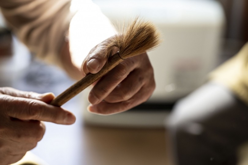 それで、「真っ当な仕事をしたい」という妙な正義感(笑)がふつふつと湧いてきて、洋服ブラシの問題点を考えていた時に出会ったのが筆屋です。毛筆に使う筆の毛は、ふわふわと柔らかいのに、墨汁を付けるとコシがしっかりあって、書いてもクセがつかず、アタリが柔らかい。それを知って、「デリケートな生地のホコリやゴミをかき出すのに向いている」と思ったんです。