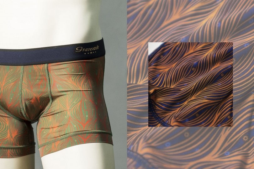 <グレイブボールト>の商品ラインナップにはもうひとつ、ビキニがあるのだが、今回、ビキニは見送られた。理由を尋ねると、単純に銅冶氏が履かないからだという。「意外とビキニ、良いっスよ」という話から現場は下着談義で盛り上がった。初めて履いたボクサーブリーフに大人を意識した話、コットンよりもナイロンのほうがウールのスーツには滑りがよくて履きやすい、果ては男同士だからこその、ちょっと書けない話まで。