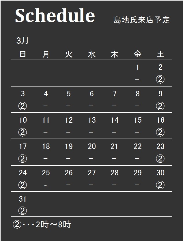 *都合により、来店予定が中止または変更になる場合がございます。また、時間帯により不在の場合がございます。