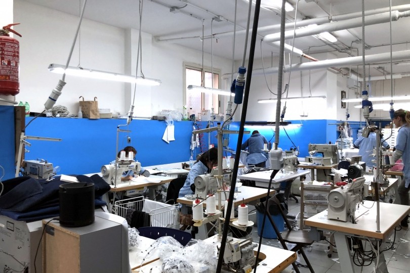 工房に入り、目に飛び込んできたのは、海湾都市のナポリらしくブルーの作業着を纏った女性たち。彼女たちは皆、工房の近くに住み、地域を愛し、仕事を愛してやまない。なかには、創業当時から働く女性や、親子2代で働く者もいた。