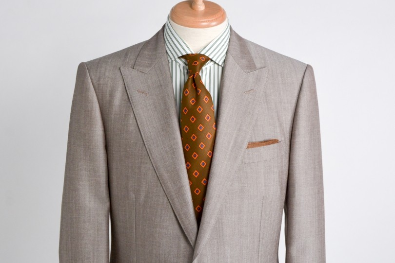春夏らしさ満点の淡いベージュのスーツに合わせるのは、レギュラーカラーのグリーン×白のダブルストライプシャツに<FRANCO BASSI/フランコ バッシ>の小紋プリントタイ。着こなしは正統派にすっきりとまとめて、ナポリの太陽に似合うようなブラウン系のバーズアイが良く映える。