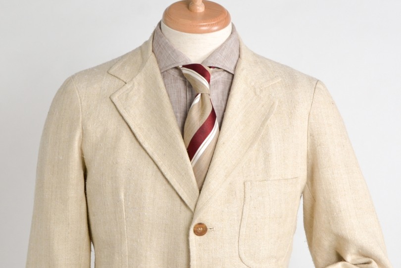 ナチュラルカラーのリネン素材を使ったシャツジャケットに<LUIGI BORRELLI/ルイジ ボレッリ>のリネンシャツを合わせるという遊び心も秘めながら、<stefanobigi/ステファノビジ>のレジメンタルタイをキュッと。色のハーモニーを重視した最旬着こなしだ。
