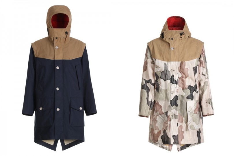 中でも一際注目を集めるのが、1951年に誕生した米軍を象徴する「M-51」パーカをもとに、アウトドア要素をミックスした都会的なジャケットへと昇華した「フィッシュテイルパーカ」だ。表面は、高密度コットン素材を用いたネイビー×ベージュのカラーブロックでシックな配色に。裏面には、<ウールリッチ>のアイコン「バッファーローチェック」を大胆にプリントし、<グリフィン>の拠点「ラブランド ファーム」のグラフィックが施されている。着脱可能な袖を外せば、ロングベストとしてもお楽しみいただけるのだ。また同モデルには、表面に、英国陸軍が採用するリップストップ生地のカモフラージュ柄を、裏面にはバッファローチェックパターンがプリントされたバージョンも揃う。