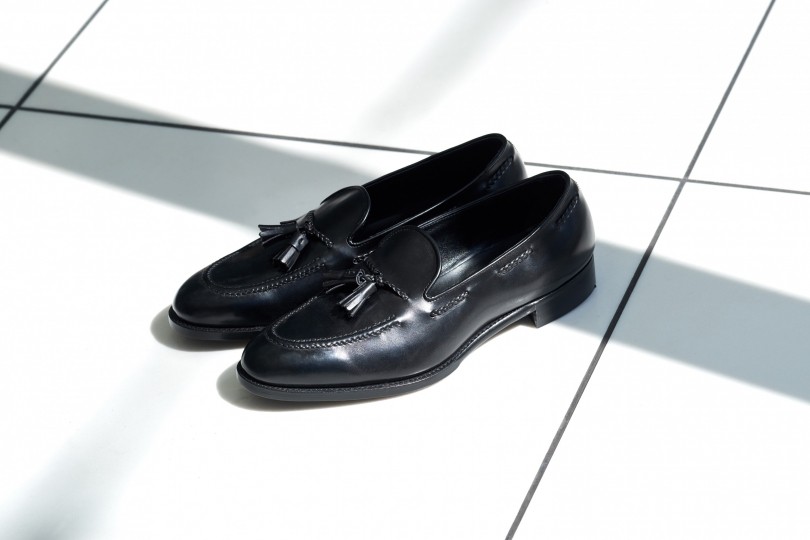 繊細に編み込まれたレザーメッシュが古き良きタッセルスリップオンを彷彿とさせる一足。艶やかなブラックカーフレザーと相まって、ジャケパンやスーツの足元に合わせて位負けしない佇まいがある。木型はR2010。