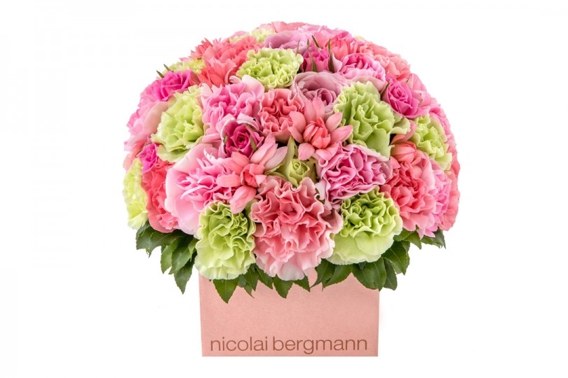 一度見たら忘れられなくなる鮮やかなピンクのカーネーション、紫陽花、ブルームをベースに、ダリアを絶妙なバランスであしらった<ニコライ バーグマン フラワーズ & デザイン>の店頭限定フラワーデザイン(*)。ループしたユーカリの葉がアクセントとなり、全体の調和を美しく整えています。 どんな場面も鮮明に彩りを添えてくれます。