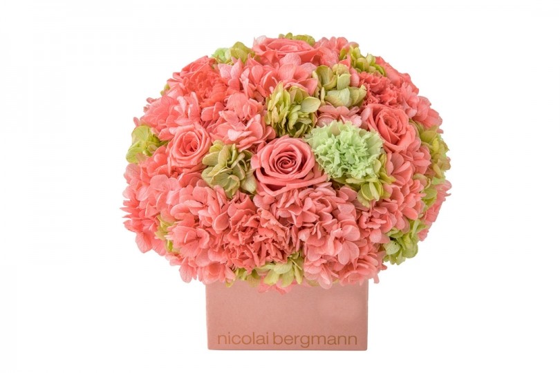 一度見たら忘れられなくなる鮮やかなピンクのカーネーション、紫陽花、ブルームをベースに、ダリアを絶妙なバランスであしらった<ニコライ バーグマン フラワーズ & デザイン>の店頭限定フラワーデザイン(*)。ループしたユーカリの葉がアクセントとなり、全体の調和を美しく整えています。360度どこから見ても彩りが溢れ出す、とっておきのフラワーアイテムです。
