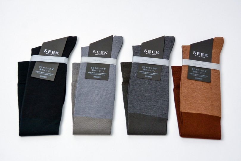 <シーク>のホーズは、ふくらはぎ部分に滑りが良く、吸湿性に優れたキュプラを使っていて、パンツにまとわりつきにくく蒸れにくいオリジナル仕様が特徴。静電気が起きにくいので、パンツがずり上がっていることに気づかず歩いているということも無くなるだろう。オールシーズン快適に穿けるので、リピーターも多い。
