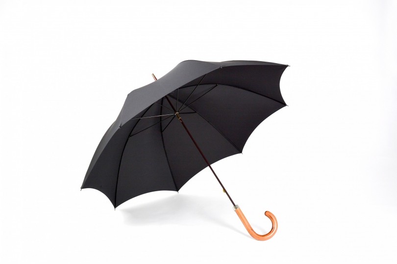 ステッキ風の細身のシルエットとクラシックなデザインで不動の人気を誇る<フォックス・アンブレラ>の“王道”長傘。細巻の秘密は8本骨と直径8mmのスティールチューブ(中棒)で、傘を開いたときはもちろん、傘を閉じたときのフォルムの美しさは格別。ハンドル(手元)はダークな木目のタモ材です。