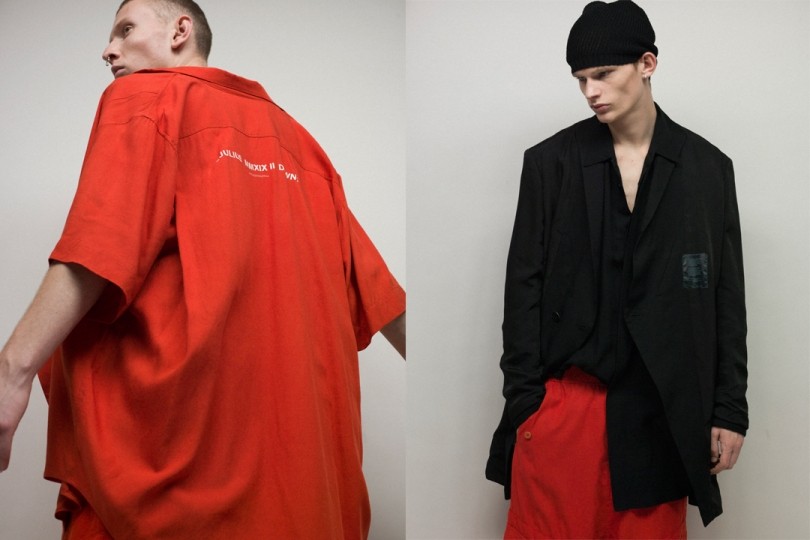 今回登場する2019年秋冬プレコレクションは、”何かの始まりと、何かの終わりを同時に感じる一瞬、精神世界との通路としての瞬間”を意味する[DAWN;]がテーマ。「朱」の色が特徴的で、メインアイテムであるジャケットやシャツ、ドレッシーなカットソーなどは、現代におけるユリウスの「フォーマル」を再解釈したドレススタイルを表現している。