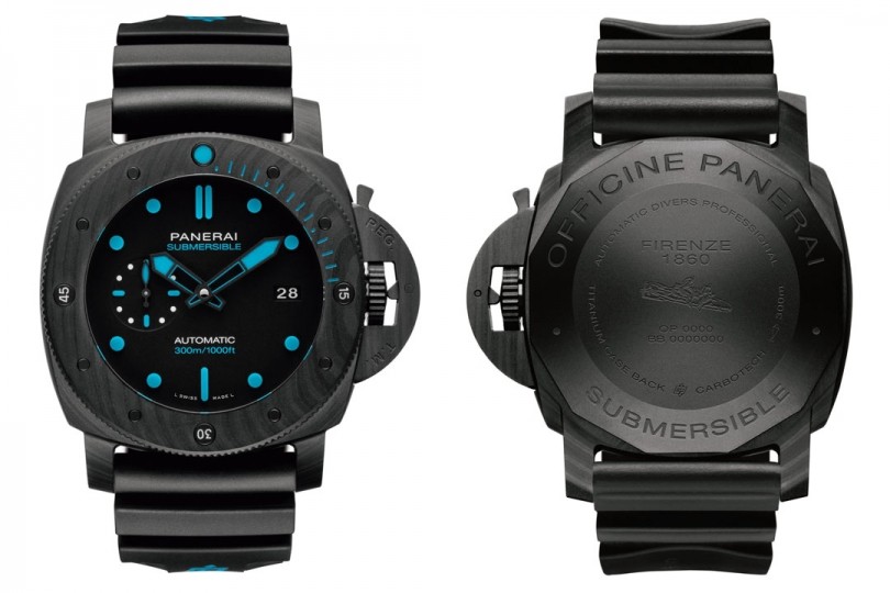 強靱かつ軽量なカーボン系の複合素材、カーボテック™をケース、ベゼル、リュウズプロテクターなどに用いたバリエーション。鮮やかなブルーのインデックスは、暗所での高輝度特性に優れたスーパールミノヴァを用いる。