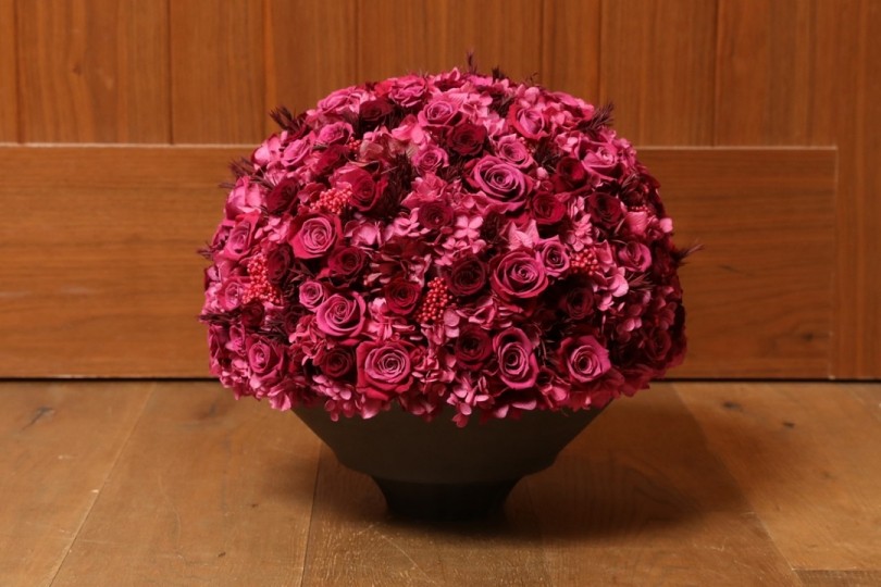 また、リビングや寝室、オフィスなど、置く場所に合わせてお選びいただけるよう、大小さまざまなアレンジメントもご用意。晴雲山 岡田窯九代目、岡田泰氏の萩焼や、ニコライ氏とも交流のある沖縄の若手陶芸作家、本田伸明氏、デンマークはコペンハーゲンの<ジョージ ジェンセン>など、こだわりある花器を贅沢に揃え、それぞれの器の特徴を活かしながらプリザーブドフラワーによるデザインを加えています。