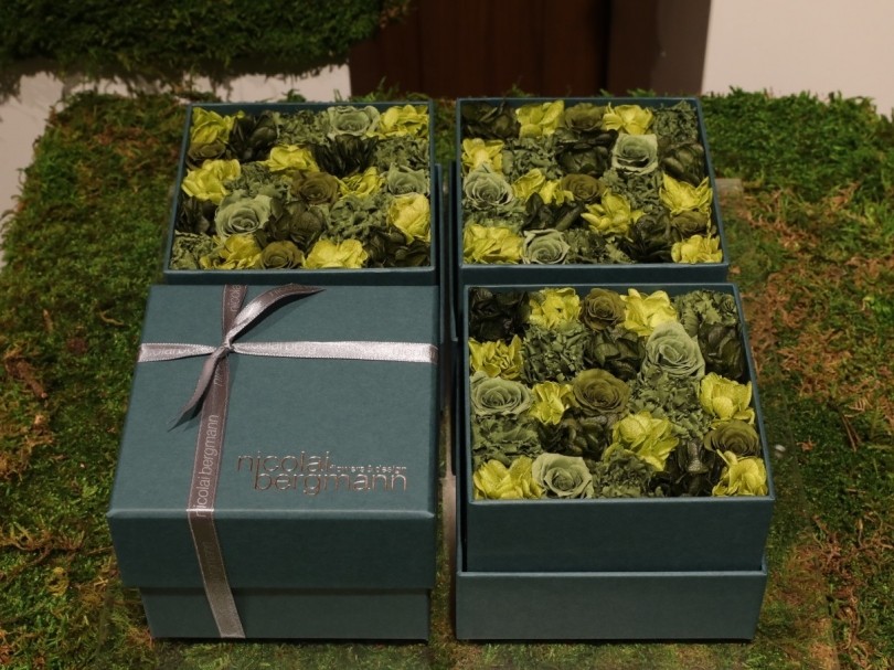 爽やかで聡明な印象を放つ独特な色合いのビリジアングリーンのBOXに合わせて厳選されたカラーグラデーションは、メンズ館らしいスタイリッシュな色彩。同ボックスを使用した、フレッシュフラワーボックスアレンジメント(S/4,320円)もご用意がございます。