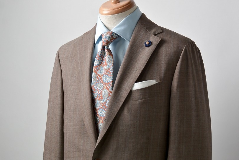Vゾーンは爽やかなブルーのシャツにペイズリープリントのタイで、都会的なサファリテイストをドレスとして料理。エキゾチックモチーフの装飾性を愉しめるのも夏の特権だ。