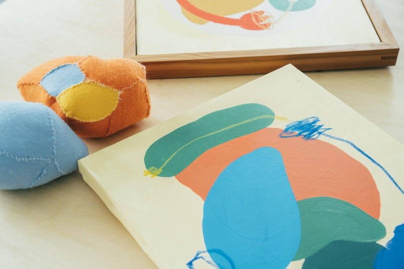 「私の作品は青、オレンジ、黄色とか、原色をすごい使っているんですけど、最近何気なく自分の作品を見ていたときに「(私は)この色たちが好きなんだ」っていうことをようやくわかってきたといいますか(笑)。もちろんそこから変わったりもすることはあるんですけど、結局この色に戻るんですよ。さっきの3色以外に、緑とか青とか赤とかっていうのも好きですね。自分のそういう部分に気づいたので、あえてテーマをつけるなら「色」かなって。だから今回は、絵画も立体物も同じような色を使った作品をお見せできると思います」