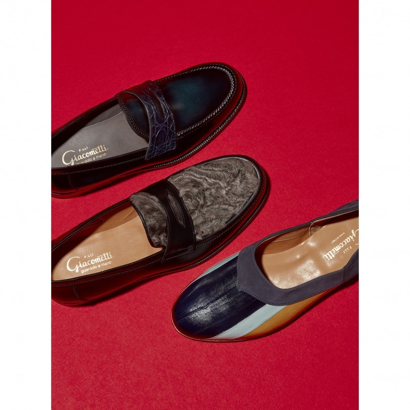イタリア・ヴェネト地方にあるメーカーのオリジナルブランド。著名ブランドの靴も数多く手がける、多彩かつ巧みな靴づくりを反映するような素材選び。今回はウィメンズウェアによく使われるアストラカンやイールスキン(ウナギの革)などをチョイス。ウナギはあえて異なる色を組み合わせている。