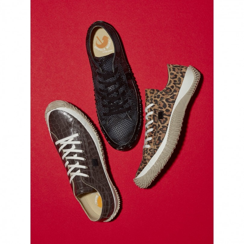 広島の自社ファクトリーでつくられる、バルカナイズ製法の靴で、世界的にも知られる存在。クロコダイルやパイソンの型押しやレオパード(ヒョウ)柄のプリントを配した素材を使ったスニーカーは、どこかポップな存在感。軽快な着こなしができそうだ。