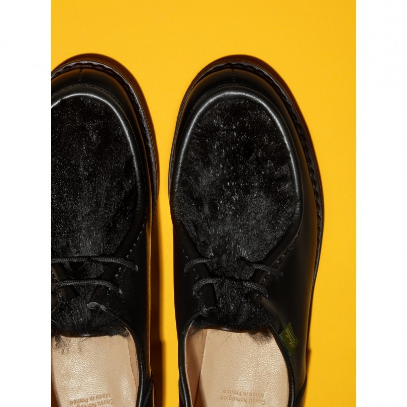 同ブランドを代表するチロリアンシューズ「ミカエル」。そのエプロン部分にはこれまでもさまざまな革が使われてきたが、今回はラビットファーを採用。もともとウィメンズで展開していたモデルの、メンズバージョンやわらかな毛足のファーは質実剛健な靴に、柔和な表情をもたらしている。