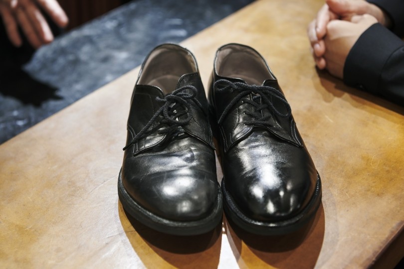 内澤さんの私物であるオールデンの靴。向かって右側が磨き終えたもの。内澤さんの雰囲気にあわせて、鏡面磨きではなく、半ツヤ程度の自然な感じに仕上げてある。