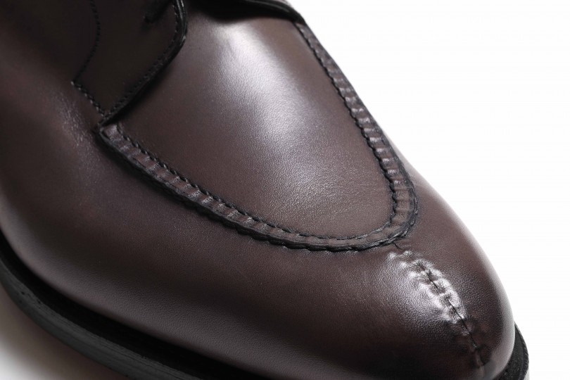 U字(モカ)部分に施されたスキンステッチをそっと指でなぞると、熟練職人が手にするイノシシの髭を撚った針の正確無比な運針を感じることができる。同じく、手仕事により縫い目を見せない仕様になっているつま先の接合部(スプリットトゥ)も格別だ。