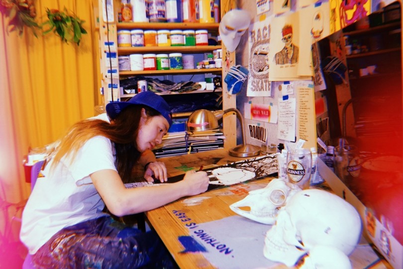 ロンドンで活動をスタートさせ2012年に凱旋帰国したHirottonは、スケートボードカルチャーやパンクミュージックなど自身のバックグランドに紐づく作品を数多く生み出している。昨年伊勢丹新宿店で行われたミュージックフェス「SOUL CAMP」においてもライブペインティングを披露するなど、“D.I.Y精神”に基づいた様々な活動を精力的に展開。