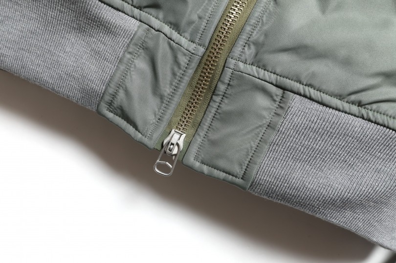 <カンタータ>のMA-1は、レディースのみで展開するものを、本企画のためにメンズ用にリサイズ。アウターシェルには耐熱性と機械的強度に優れた「66ナイロン」を採用し、密度の高いナイロン特有の光沢感と適度な張りが、無骨であるはずのジャケットに美しい艶をもたらし、気品さえもプラスした。