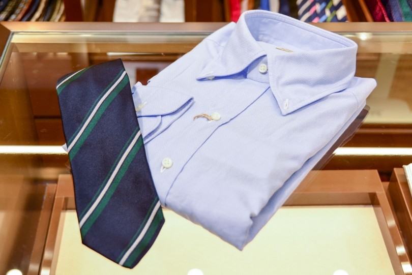 ボタンダウンは外して遊びを出したり、カラーピンを使うのもおすすめだ。クラブストライプの素材感と、シャツの素材感を合わせているところもさりげないこだわりで、イタリアから見た英国スタイルを絶妙なバランスでトレンドを取り入れた。このVゾーンの場合、ジャケットスタイルも良いが、ブレザーで合わせるのが今の気分だそうだ。