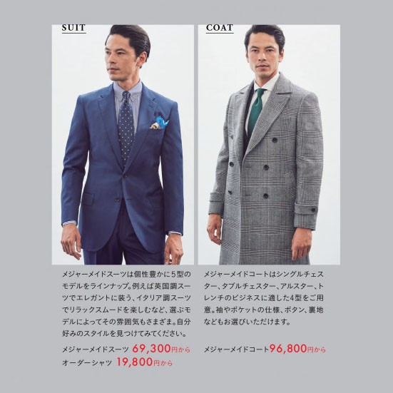 メジャーメイドスーツ 69,300円から、オーダーシャツ 19,800円から、メジャーメイドコート96,800円から