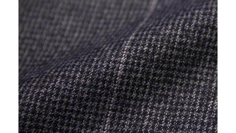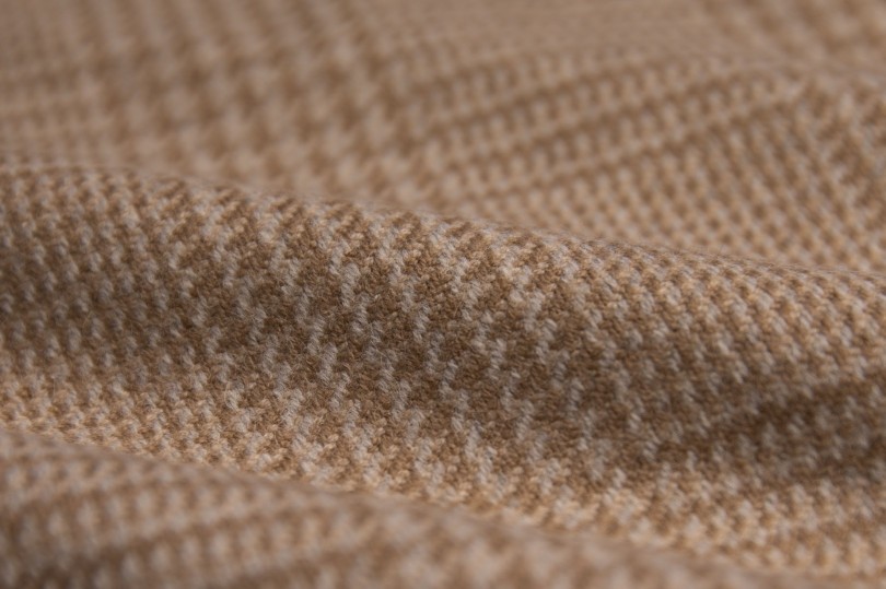 「ハウンドトゥースをベースにしながら、何色もの色糸を使うことで深みのある色柄に仕上げています。英国のヴィンテージ生地の風合いを作り出すために、さまざまな工夫を凝らしているのですが、ここまで手の込んだ仕上がりが出来る企画力と技術力の融合は日本の職人仕事という感じがしますね」。