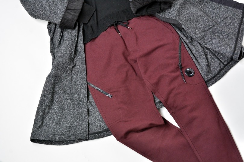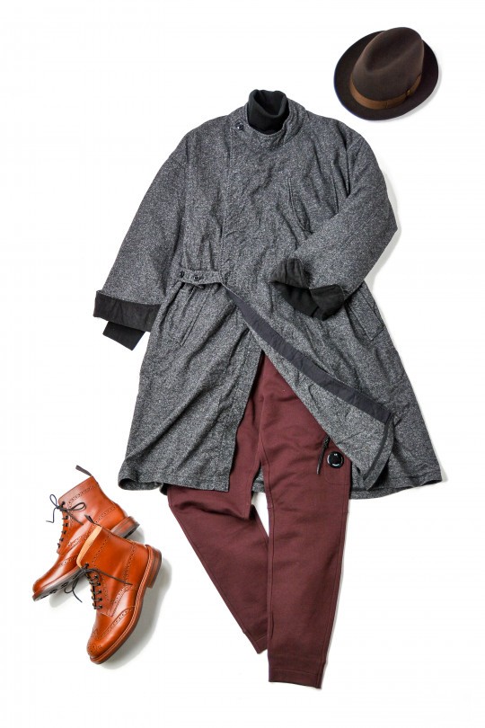 7階で見つけた<エンジニアド ガーメンツ>のコートをメインに、黒のタートルとボルドーのスウェットパンツ、そして、靴でコントラストを効かせたコーディネートです。