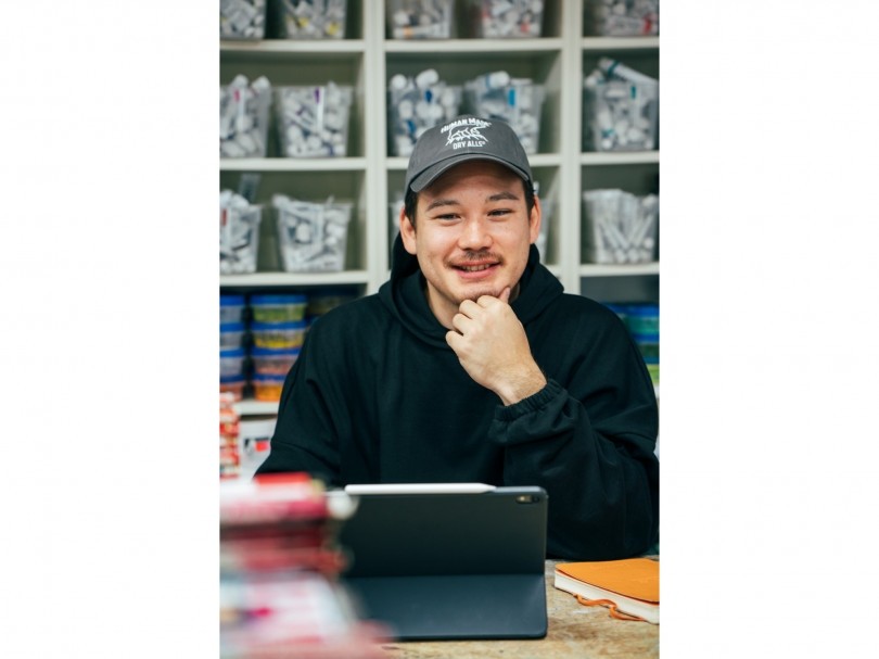 取材場所であるアトリエには、90年代からのファッション雑誌やカルチャー雑誌のバックナンバーがうず高く積まれている。というのもクリス氏は20年前、東京のストリートカルチャーから多大な影響を受けたことから、アーティストとしての原点を見出したというのだ。