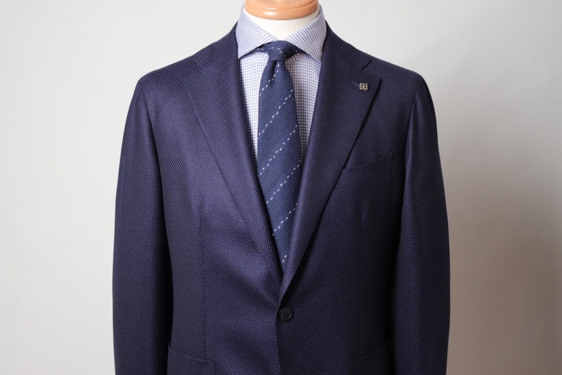 <タリアトーレ>のホップサックのシングルブレザーに、千鳥格子のシャツ、そしてハンドステッチ風の意匠が効いた珍しい仕様のネクタイでの“ブルー系トーン”合わせ。着こなしやすいブレザーでの柄シャツの着こなしの参考になるコーディネートだ。