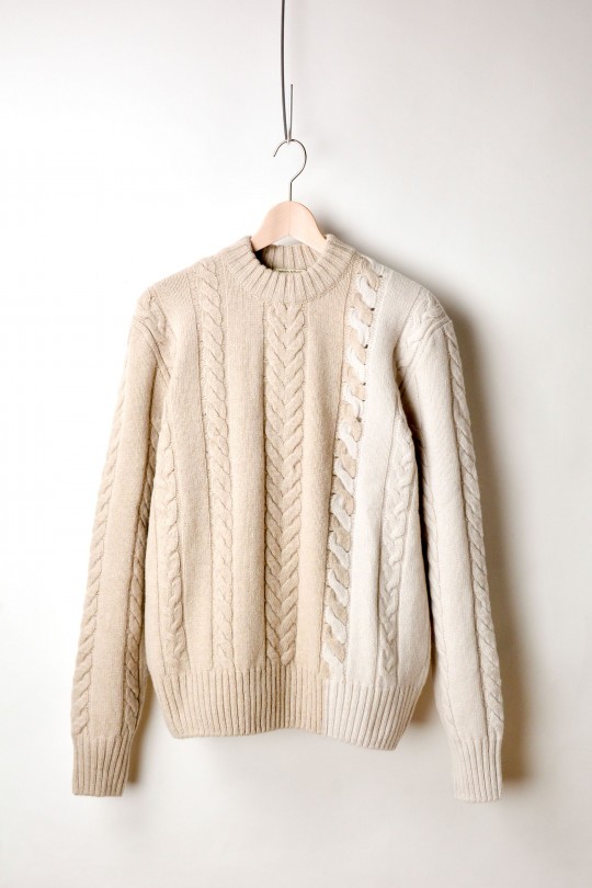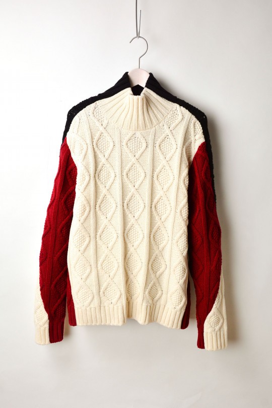 ざっくりとしたケーブルニットをマルチカラーの切り替えでブランドらしさを表現。ありそうでなかなかない、ケーブル編みのモックネックセーターは、前からも後ろからも異なる表情を持ちコーディネートの主役になる。