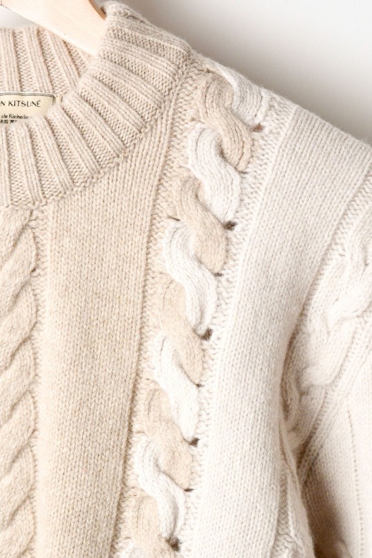 ウールとカシミヤをブレンドした柔らかな仕上がりのケーブルニットセーターは、大きすぎず程よくゆとりがあるサイズ感。デザインのディテールは、2色のケーブルが交わって編まれているのが特徴で、トラッドとモダンが絶妙なバランスで合わさった雰囲気が漂う。