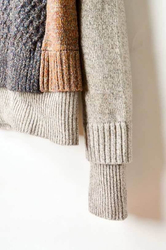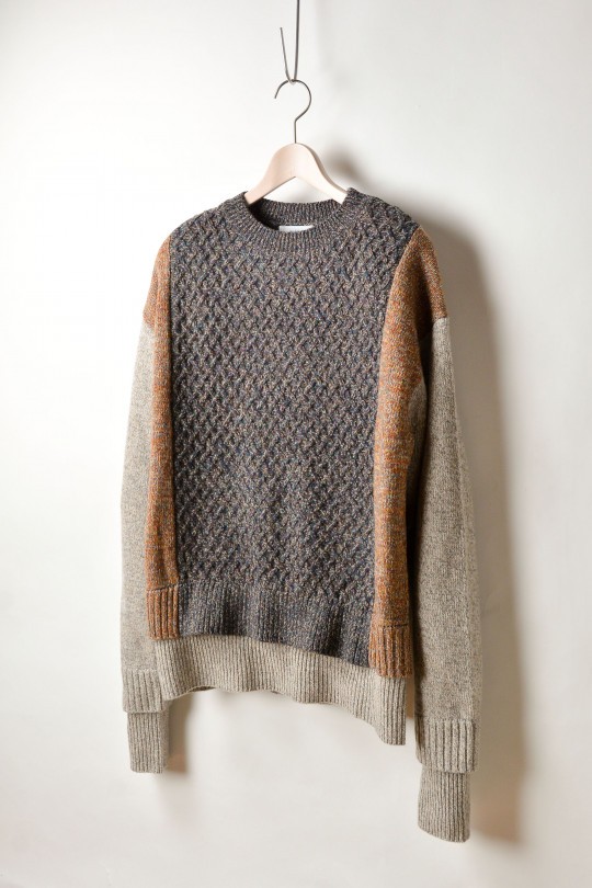 ケーブル編みと天竺編みを掛け合わせたデザインニットは、多色使いの糸を使用し、素材自体にも味わい深い、同ブランドらしい一着に仕上げられている。まるでセーターをレイヤードスタイルで楽しんでいるかのようなデザインは、リラックスしたムードに最適だ。