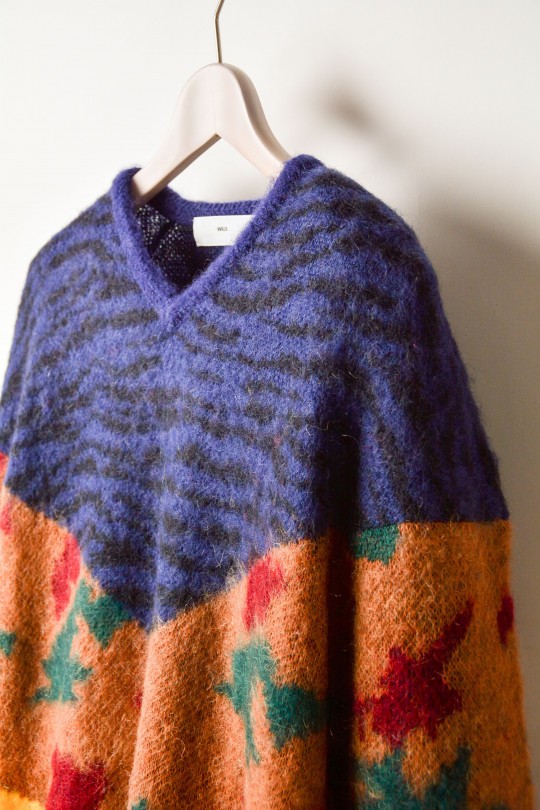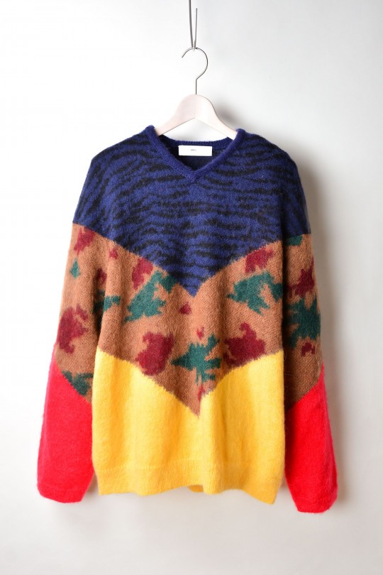 複数のアニマルパターンミックスという、アヴァンギャルドなデザインは勿論、緩めのサイジングと落ち感のある編み立てでリラックス感を演出しながらも、すっきりとした首元のVネックにより、野暮ったさを感じさせないバランス感が魅力的。