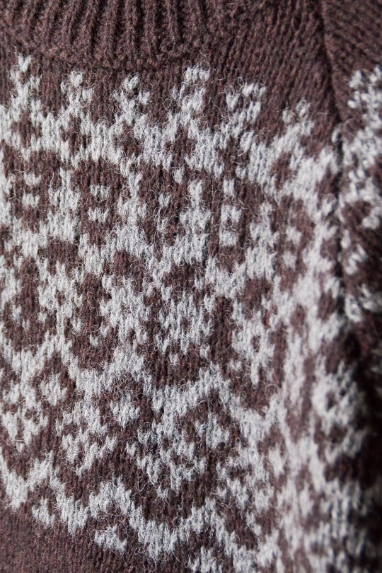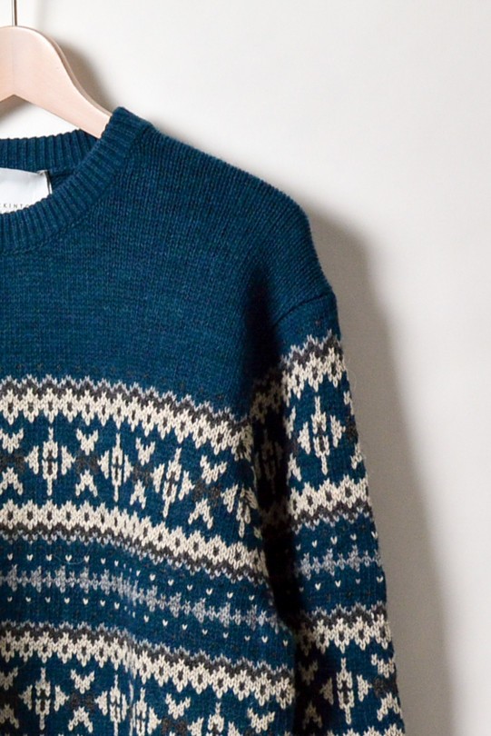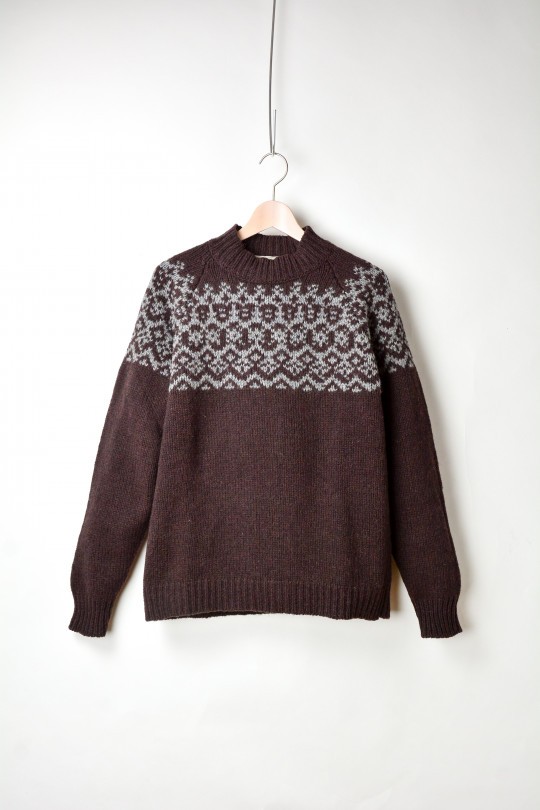 スコットランドのフェア島を発祥とする、伝統的な編み柄であるフェアアイル柄のクルーネックセーター。