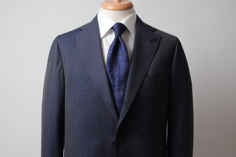 ネクタイの柄でペイズリーは大定番ですが、ソラーロ(ネイビー)のスーツに、大柄のペイズリーを織り柄で表現した、見た目にソリッドに近いクラシックなネクタイなら、悪目立ちせずにドレッシーな気分を表現することができます。ペイズリーはボウタイでもバリエーション豊富に展開している柄なので、よりフォーマル感を演出するならボウタイもぜひトライしてください。
