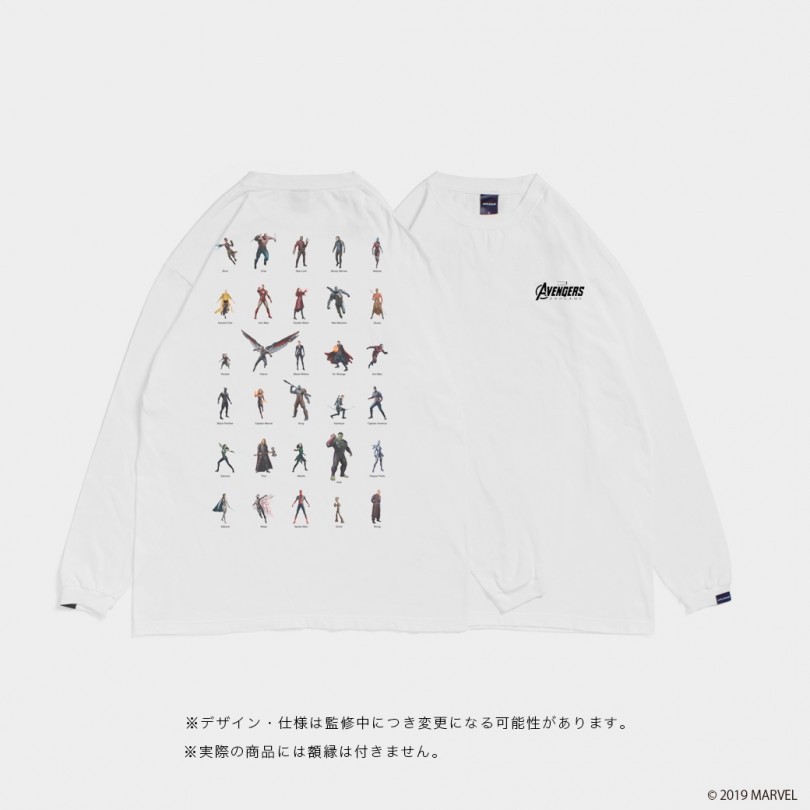 映画『アベンジャーズ/エンドゲーム」に登場するヒーロー達を背中にプリント。